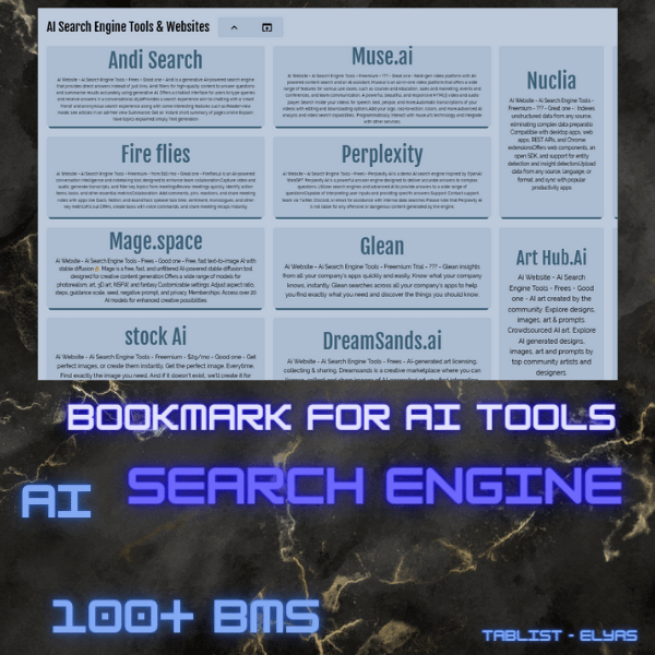 Our AI Search Engine Tools & Resources offer a carefully curated collection of AI-powered tools, organized for your convenience. Eliminate the hassle of managing multiple tabs and distractions.