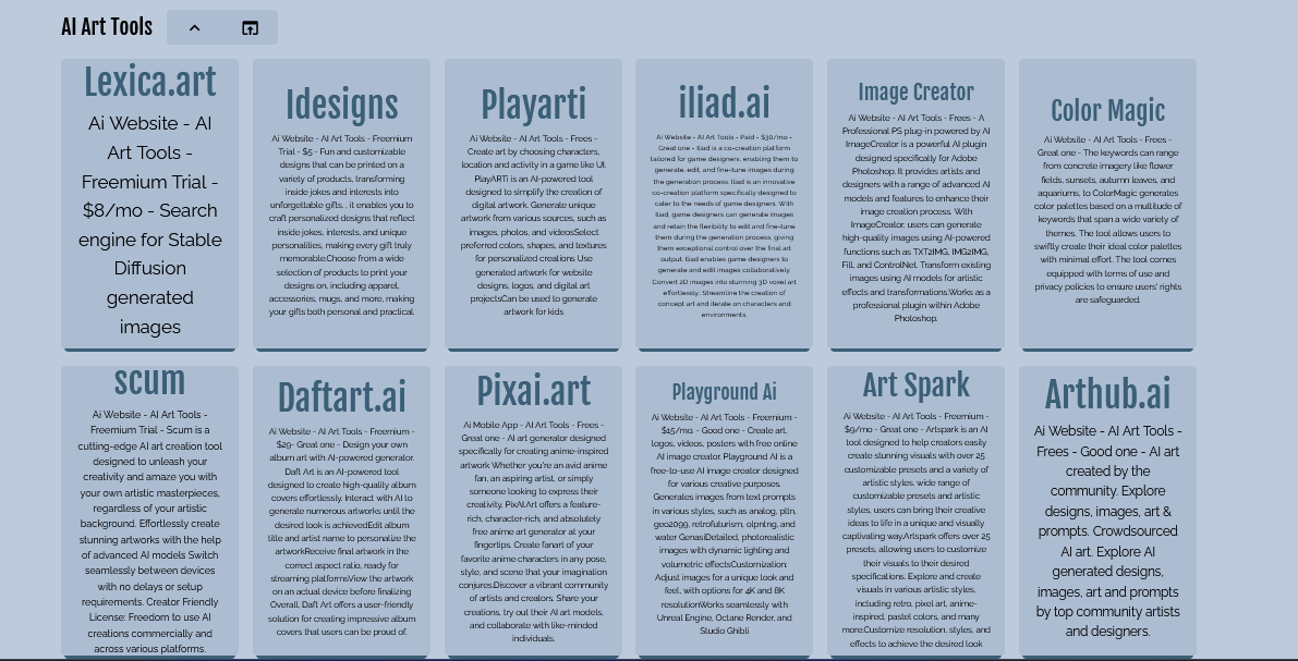 - Streamlined Learning: Quickly access a curated catalog of top AI art creation websites and tools. It’s like having an art library at your fingertips.