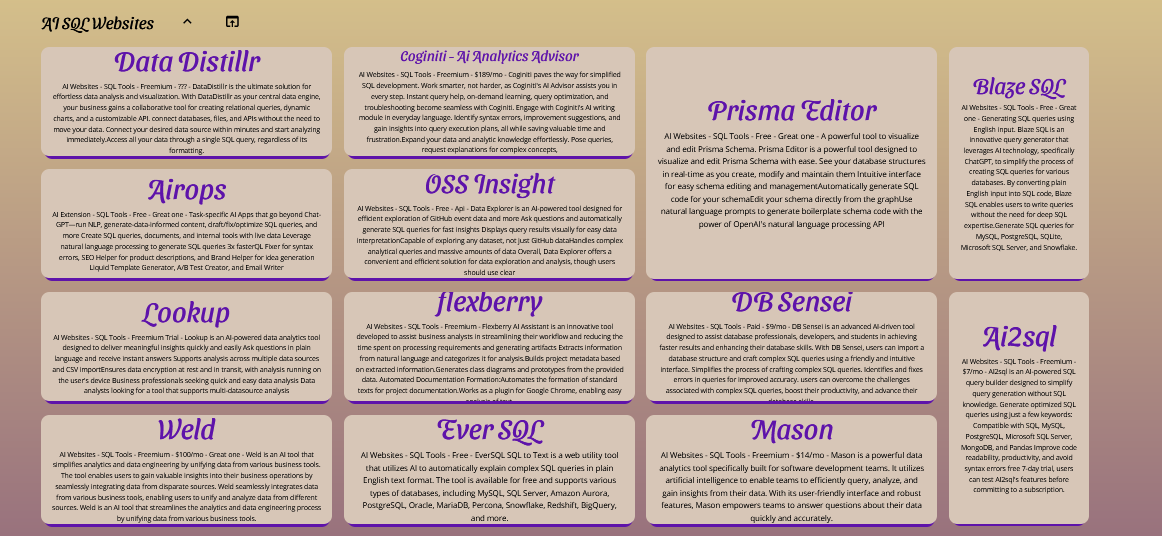 - Efficient Resource Access: Stop wasting time searching. We've gathered the best AI SQL tools and resources so you can focus on optimizing queries and managing databases effectively.