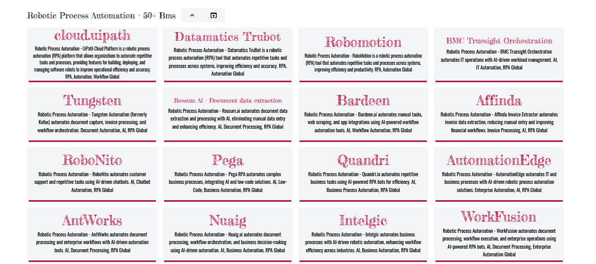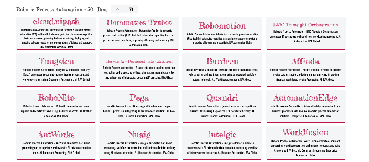 This curated collection of 50+ Robotic Process Automation (RPA) websites connects you with platforms that replicate human actions across software systems. Perfect for enterprises, IT teams, and professionals looking to boost efficiency through advanced automation.
