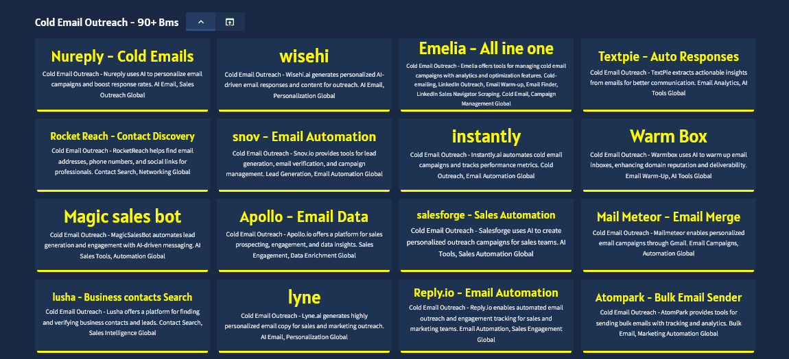 This collection of 90+ cold email outreach websites connects you with advanced platforms that automate prospecting, personalize campaigns, and maximize response rates. Whether you're a sales professional, marketer, or business owner, these tools help you build meaningful connections, generate leads, and convert prospects into customers through strategic email outreach.