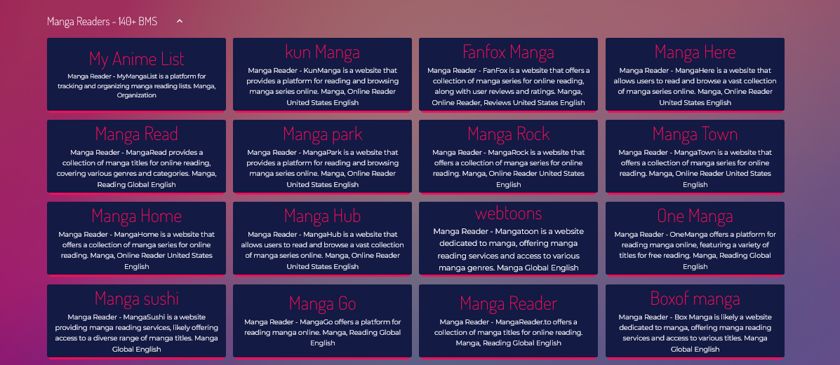 This collection of 140+ manga reader websites connects you with extensive digital libraries offering everything from popular ongoing series to hidden gems and classic masterpieces. Whether you're into action, romance, horror, or slice-of-life, these platforms provide seamless reading experiences with high-quality scans, multiple language options, and user-friendly interfaces optimized for manga consumption.