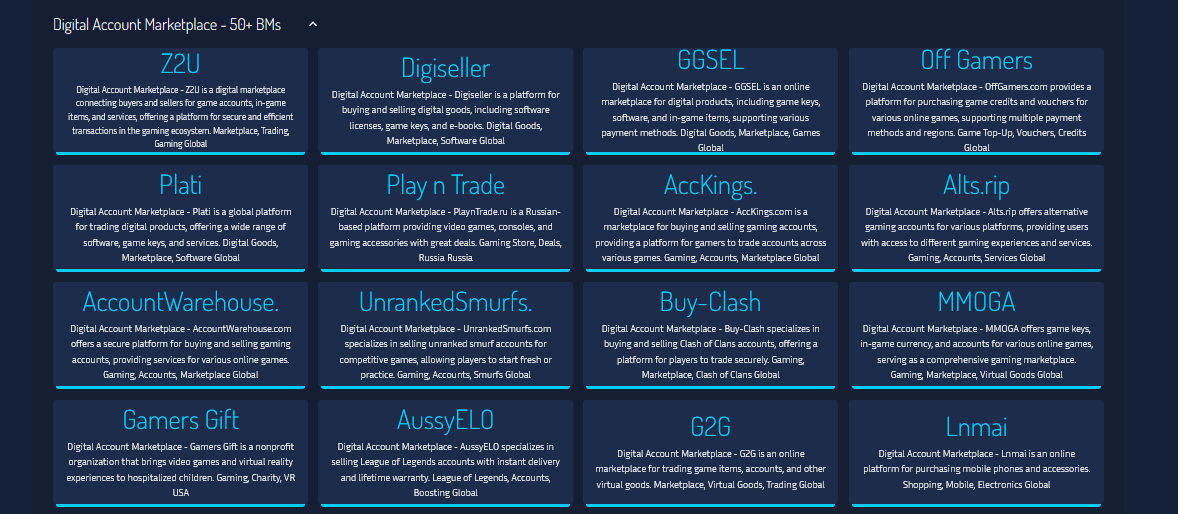 Looking to buy, sell, or trade gaming accounts safely and easily? This collection of 50+ digital account marketplace websites connects you with trusted platforms for acquiring high-level accounts, rare items, and in-game currencies across a wide range of titles. Ideal for gamers, collectors, and resellers.