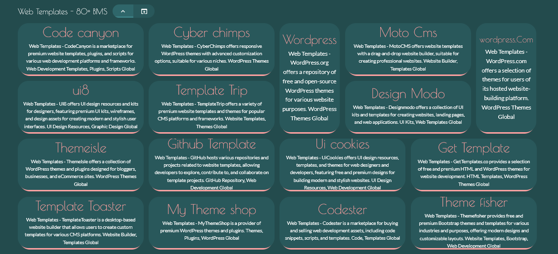 - Diverse Template Options: Access bookmarks featuring a wide range of web templates, including designs for business sites, portfolios, blogs, and e-commerce platforms.